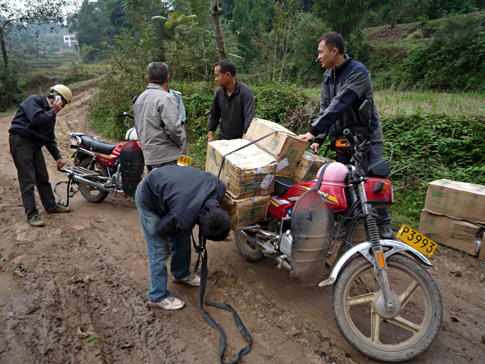 乌云密布天空也阴沉下来,恐及下雨之后路更艰难进去之后也无法回撤,和常老师商量后,老师电话通知了几部摩托车前来搬运书籍。