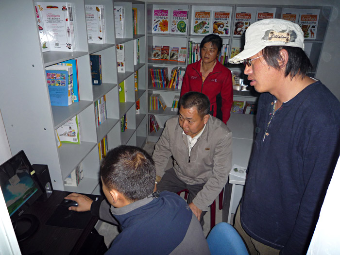 所有物资都运送抵达学校之后,我们整理出一间老师办公和休息室。开始整理书籍和安装书架,耐心的教授起常老师使用计算机……