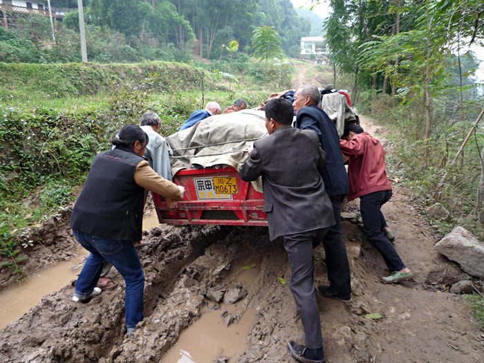 坑坑洼洼的路面,下过雨之后泥泞不堪,刚驶下一个泥坑路山坡,我们的车就被前面一个三轮车陷入泥坑挡住道路。村民齐心协力把三轮车推出泥坑。