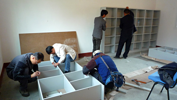 图书和书架一送到,李璐和几个老师就开始在图书室敲敲打打组装书架和阅览桌。
