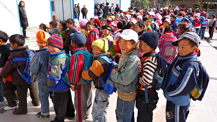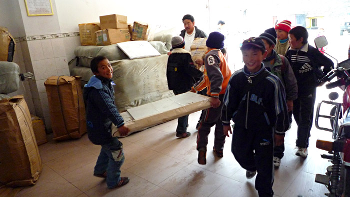 泽盖中心小学全校共有460名学生,老师28人。学校安排了高年级的学生搬运物资到特别安排的教室。山里的孩子力气特别大,一个学生就能把重达20多公斤的书扛在背上,爬 楼还箭步如飞的轻松。