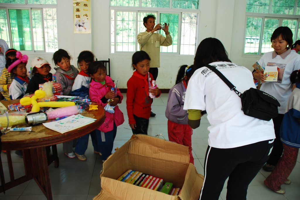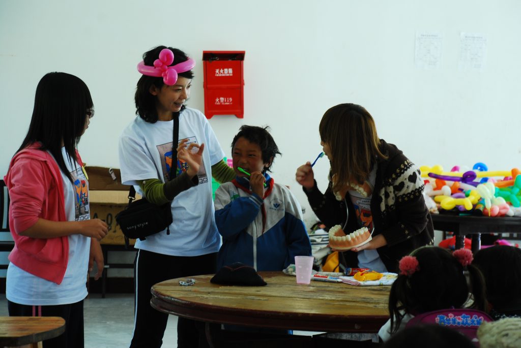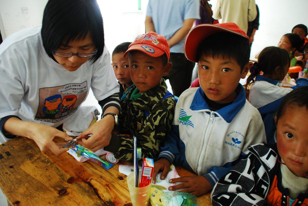 抵达赤⼟小学。这次队友众多,我们分派成两组,男⽣壮丁⼀组负责劳⼒“安装图书室”,⼥⽣组负责基础卫⽣知识宣讲等。全校117名学⽣分两梯次进到食堂这个⼤空间剪指甲, 学习洗⼿,洗脸,发放用品等。藏区的小朋友比较缺乏基础卫⽣知识,因此有些孩童在⼿,脸或脚上就有长⼀些病毒感染的〞颗粒〞。 队友们尽职的教,编唱着刷牙儿歌,孩⼦ 们也认真的学唱并模仿刷牙的动作。虽然只有⼀个下午的学习时间,但真正的目的是之后的日常⽣活中孩⼦们能养成卫⽣好习惯。学习示范之后,队友⼀⼀发放给学⽣们洗脸⽑⼱, 硫磺香皂,牙膏牙刷,漱⼝杯等。小朋友都礼貌的接过,害羞的说着谢谢。