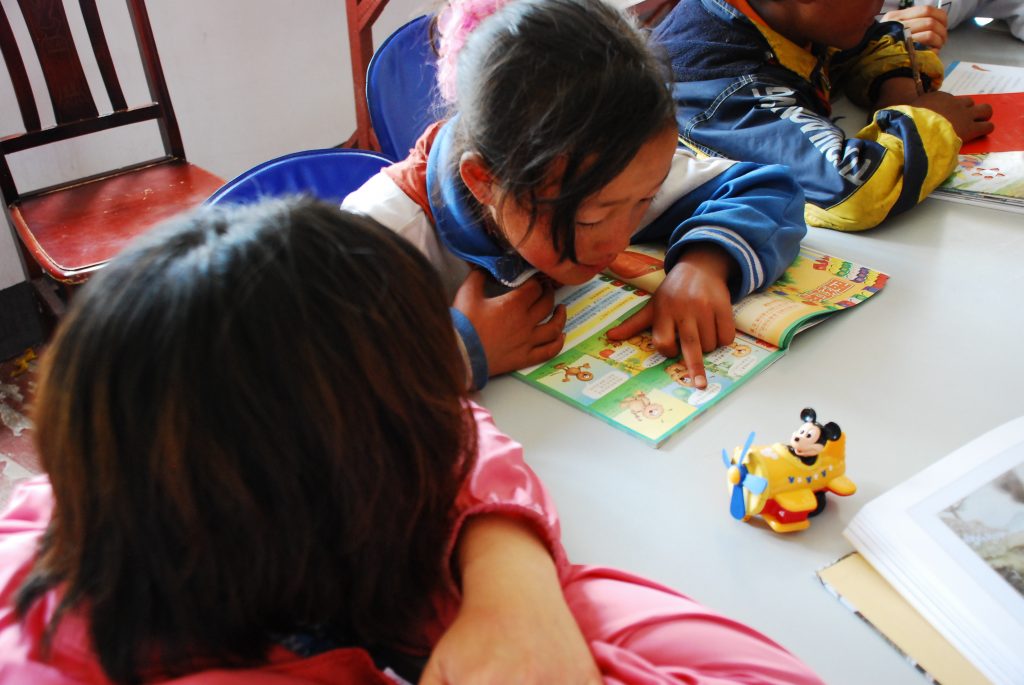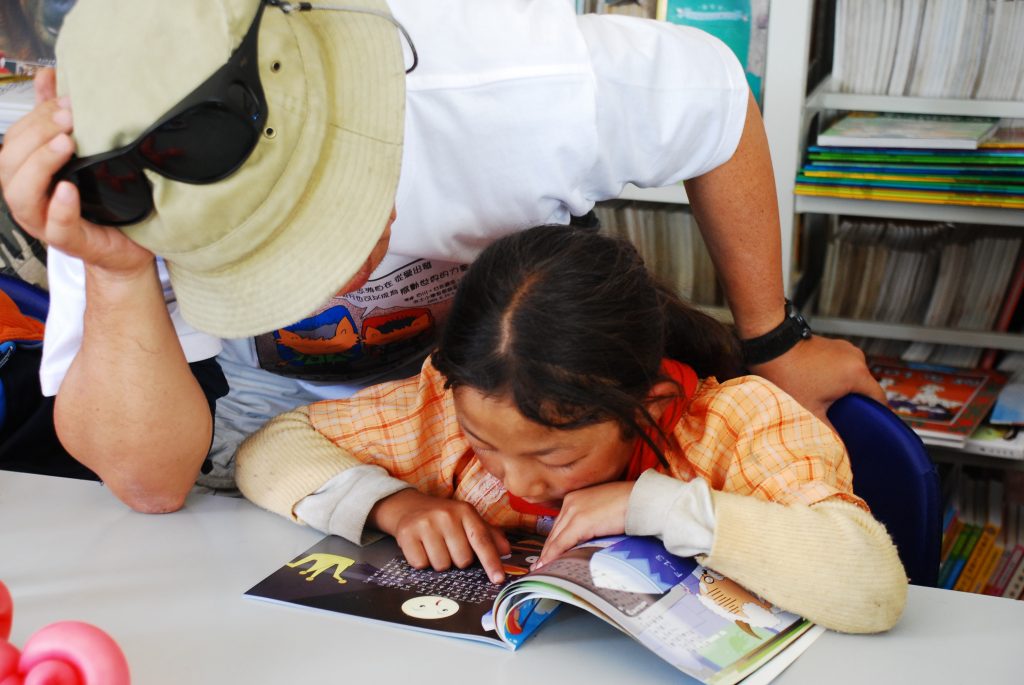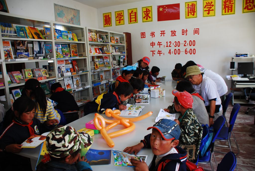 图书室的组装经过⼀个下午基本成形,在学校老师⼀起的协助下,重新布置好电源线,确定了计算机安装摆设点,图书分类之后逐⼀上架展示排列。第二日午休时图书室开放,迎 来了这群藏区的孩子们。