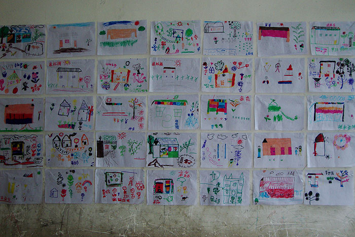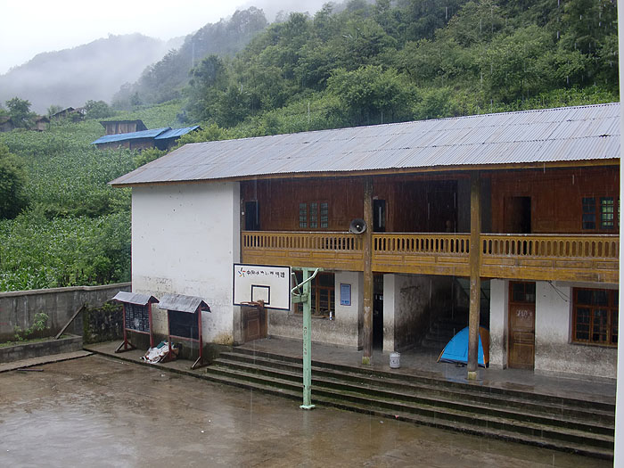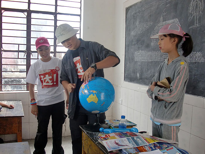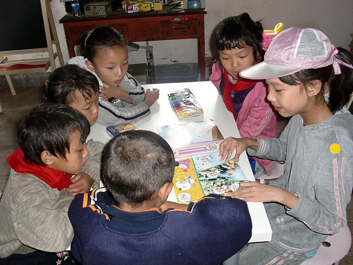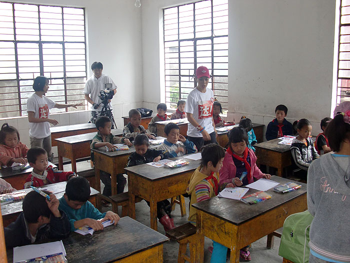 2010年7月16日,我们的车队沿崎岖的沿江简易公路抵达龙元小学已经下午,队员搬运物质上⼭顶的学校,休整下来已经天⿊,龙元小学没有电,志⼯们靠着⼿电筒的微弱灯光,组合书架和书桌。