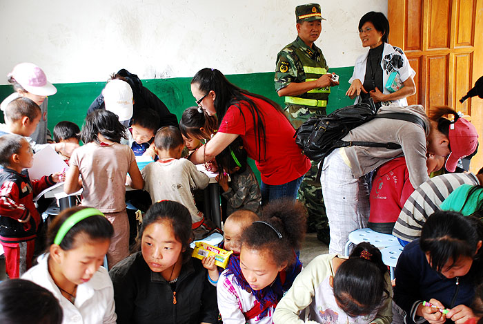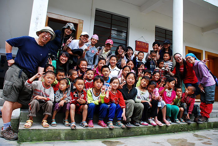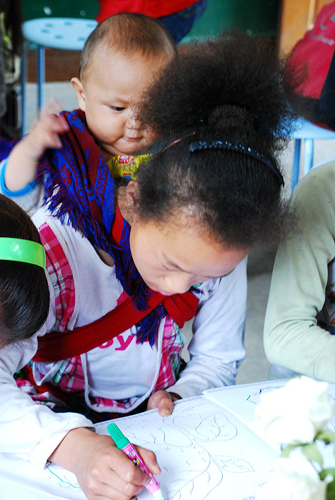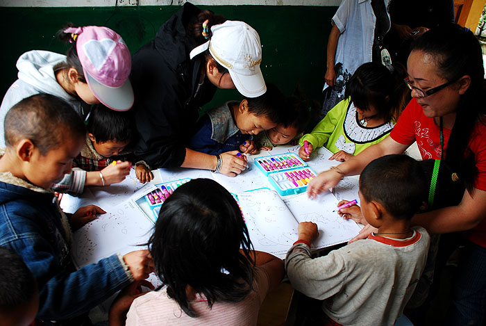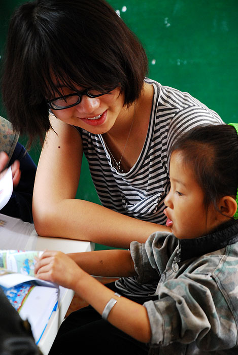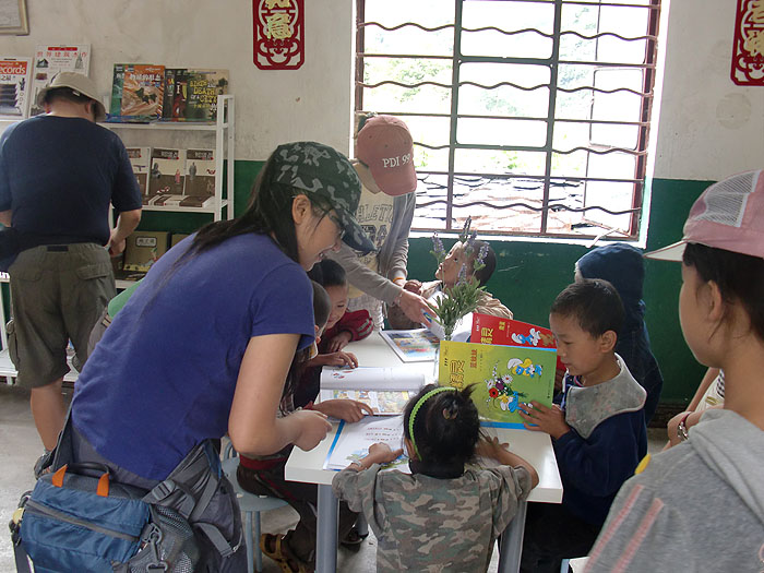 志⼯们从阴雨绵绵的独龙江乡到秋那桶修整了⼀下午后,又开始精⼒充沛的投⼊到了秋那桶村图书室的援建中.刚整理好图书室,孩⼦们就聚集过来看书了,精彩的绘本吸引他们来 阅读,连中⽂不是很好的janey也开始尝试给他们中⽂讲故事。可能是从小就参加教会的唱诗班,孩子们唱起歌来婉转动听,优美的旋律回旋在整个秋那桶小学的上空……