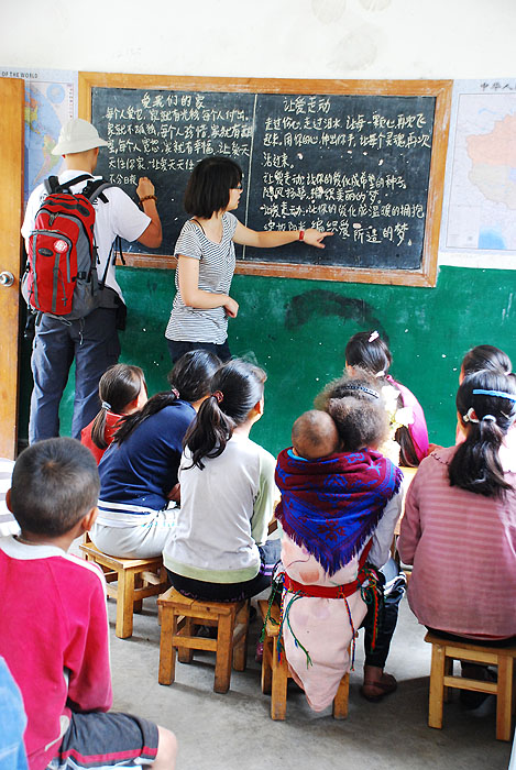 秋那桶村小学已经搬迁到丙中洛中⼼小学,孩子们已经不需要到这里来上课了,但是周末孩⼦们回到村⼦,还是会聚集在原来的旧学校一起游戏玩耍。2010年7月20日,在⼀位选择在秋那桶安家的台湾⼤姐的提议下,我们就利用空置的旧教室,建立起⼀个小小的社区图书室。