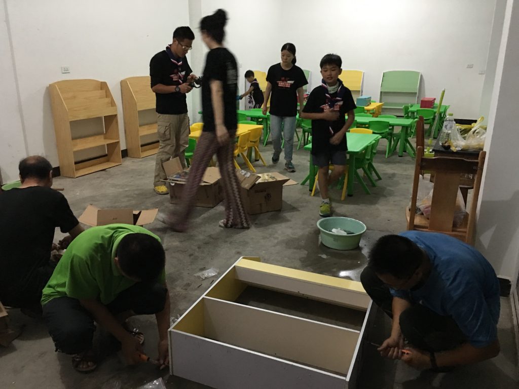 2016年7月10日,志工们一到达便开始装饰整理图书室。不一会,书架上呈现出了整齐排列的图书,图书室室内中间摆放着许多小板凳小桌子。