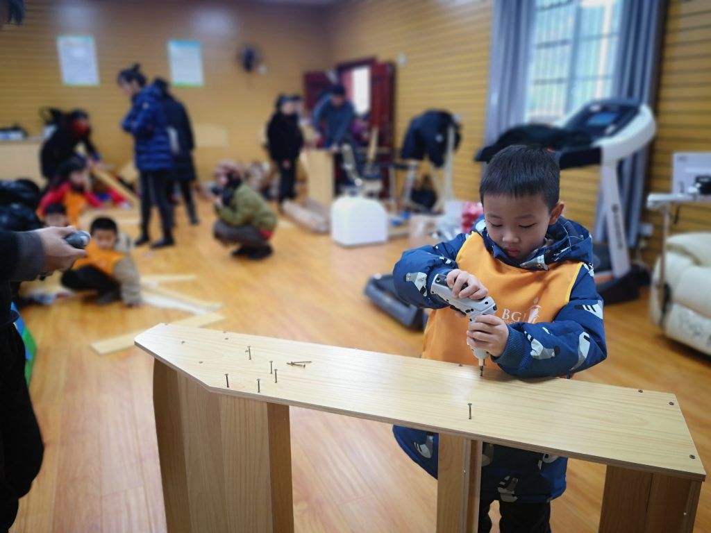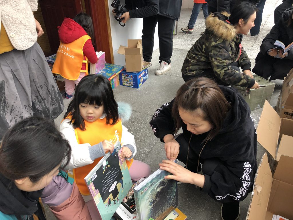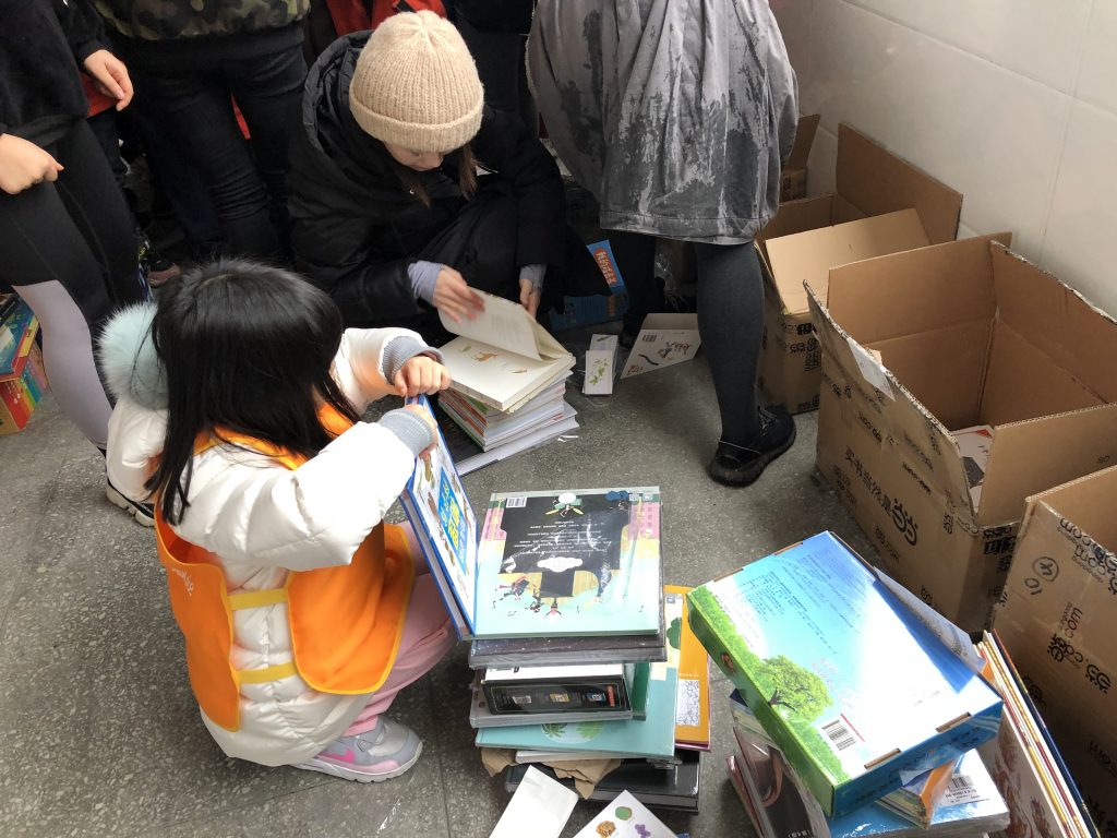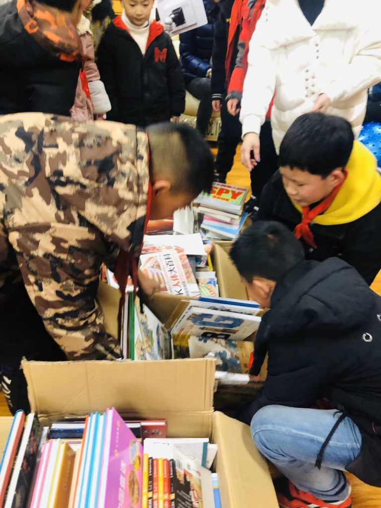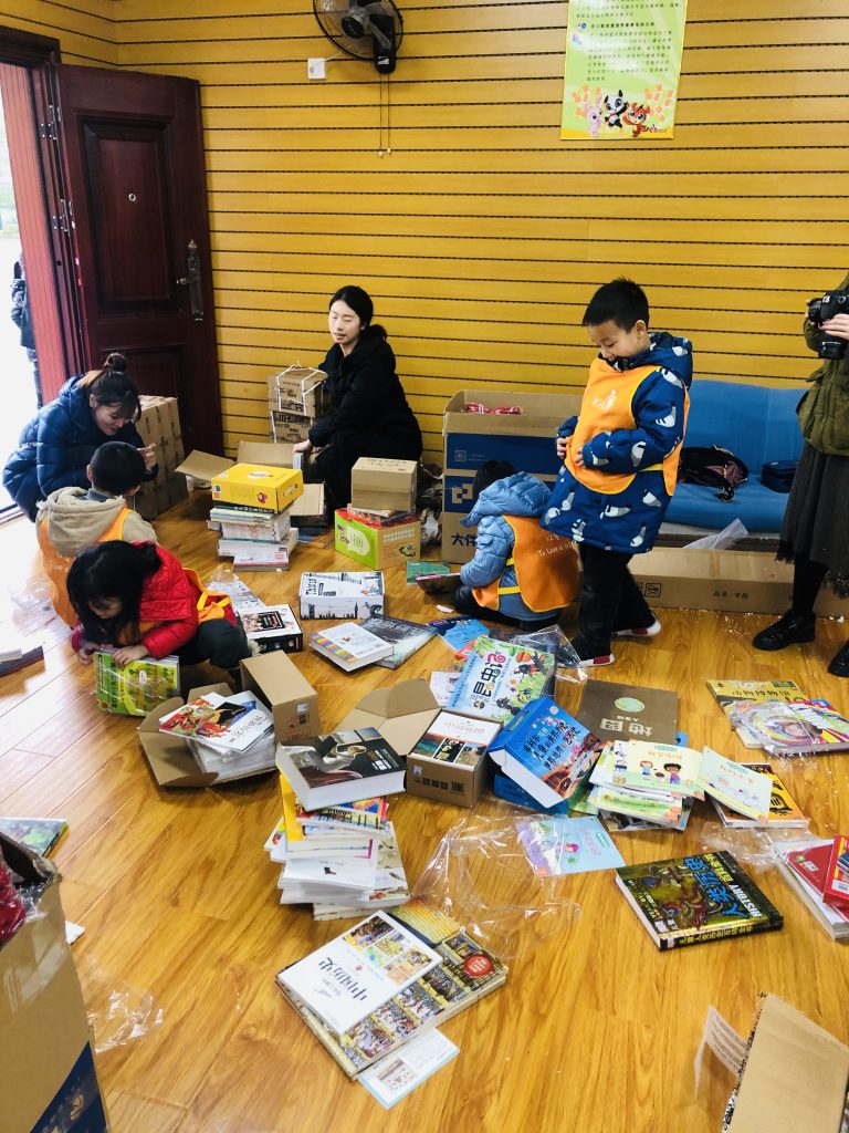 早上七点半出发,到达学校已经十二点半,简单的在学校食堂用过午饭后开始干活,家长志愿者负责组装书架,小朋友志愿者负责分拆图书,每个人都参与到图书室建设中了。
