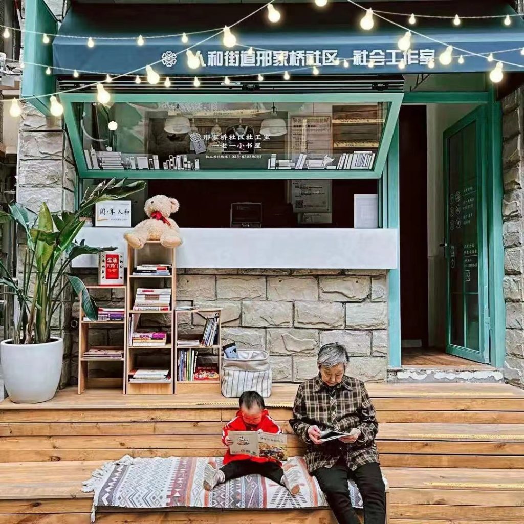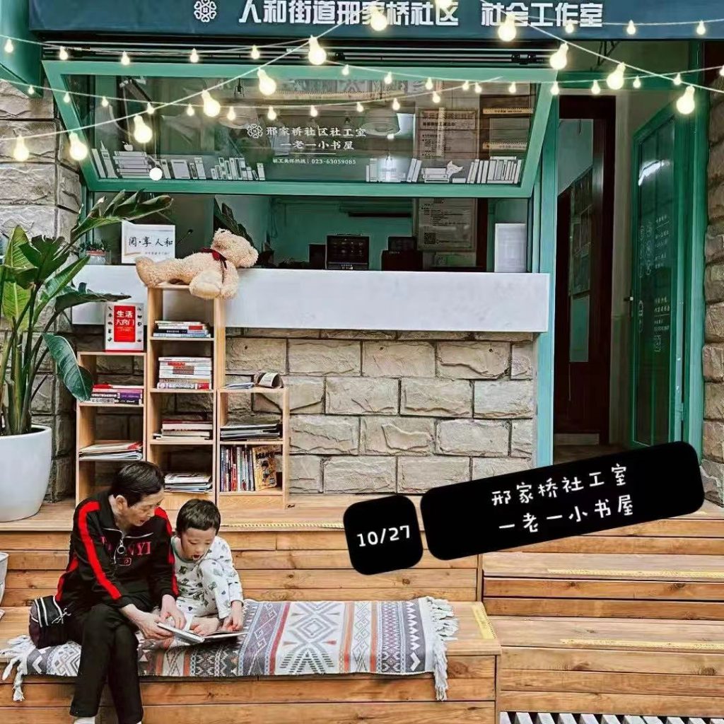 邢家桥一老一小图书室位于重庆两江新区人和街道邢家桥社区。它由邢家桥社区社工室与乐·公益联手打造。